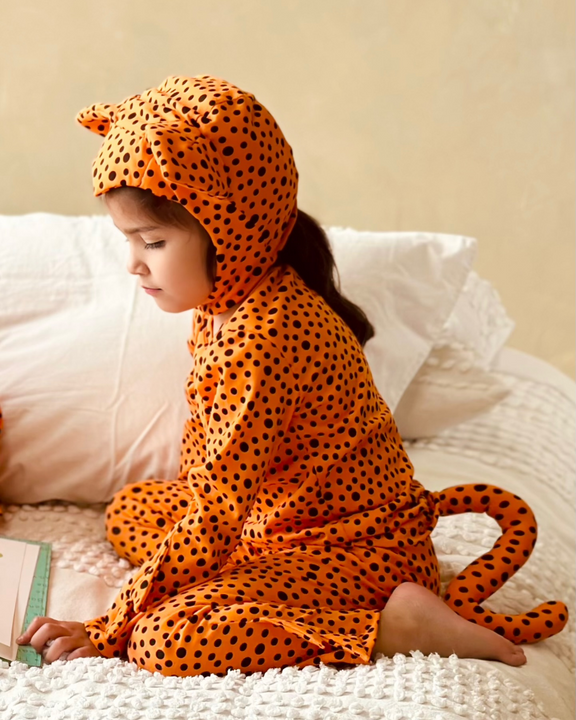 Fast, fierce, and cozy—this cheetah costume lets little ones run wild by day and curl up in comfort by night. Made from soft, stretchy cotton, it’s perfect for playtime adventures and bedtime snuggles. Accessories slip on and off with ease, making dress-up simple and fun.