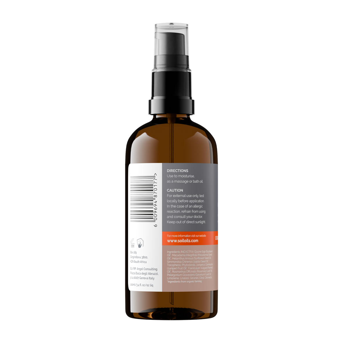 - Ingredients: Fennel, Rose Geranium, Rosemary, Juniper Berry in a base of cold-pressed carrier oils